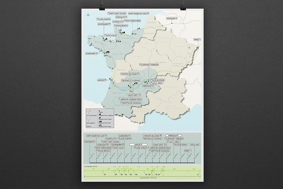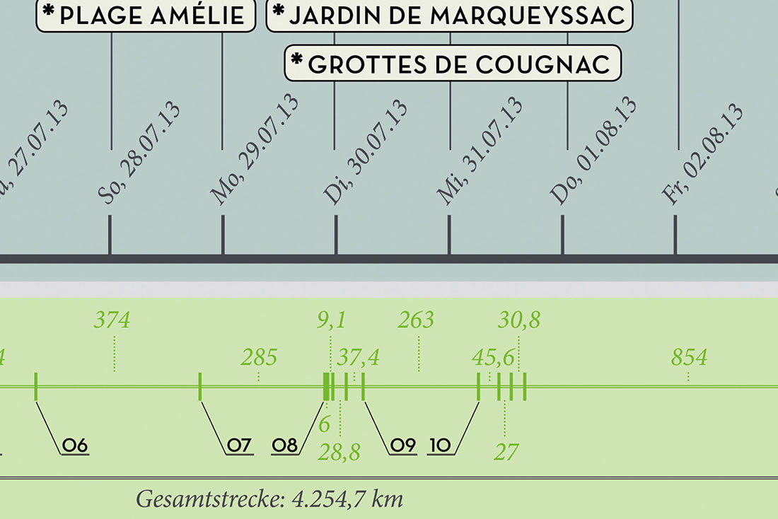 Visualisierung einer Reiseroute unter Einbeziehung von Dauer und Länge einzelner Tourenabschnitte.