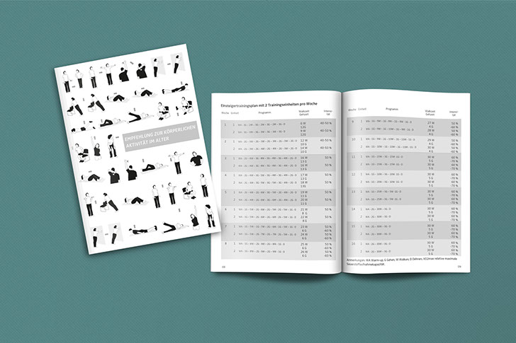 Illustrierte Broschüre für Senioren, die Anleitungen zu Sportübungen vermittelt.