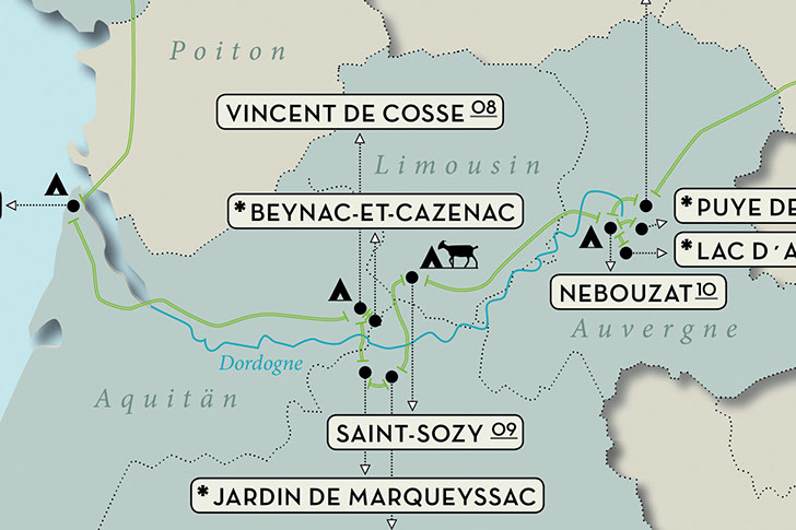 Visualisierung einer Reiseroute unter Einbeziehung von Dauer und Länge einzelner Tourenabschnitte.