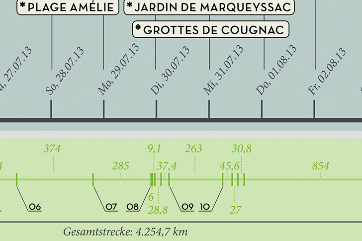 Visualisierung einer Reiseroute unter Einbeziehung von Dauer und Länge einzelner Tourenabschnitte.
